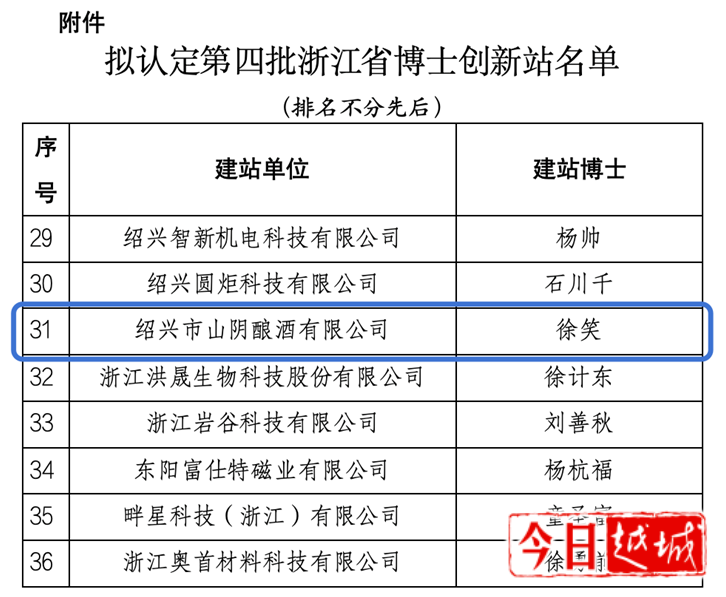 近日,第四批浙江省博士创新站认定名单公布,绍兴市5家单位入选,其中越城区企业—绍兴市山阴酿酒有限公司位列其中。