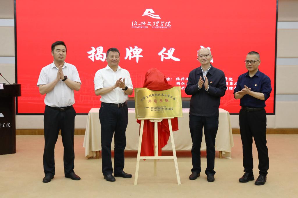 沈赤、沈继荣、黄迪钦、招生与就业处处长叶伟强共同为“大学生创新创业高质量发展共建基地”揭牌。