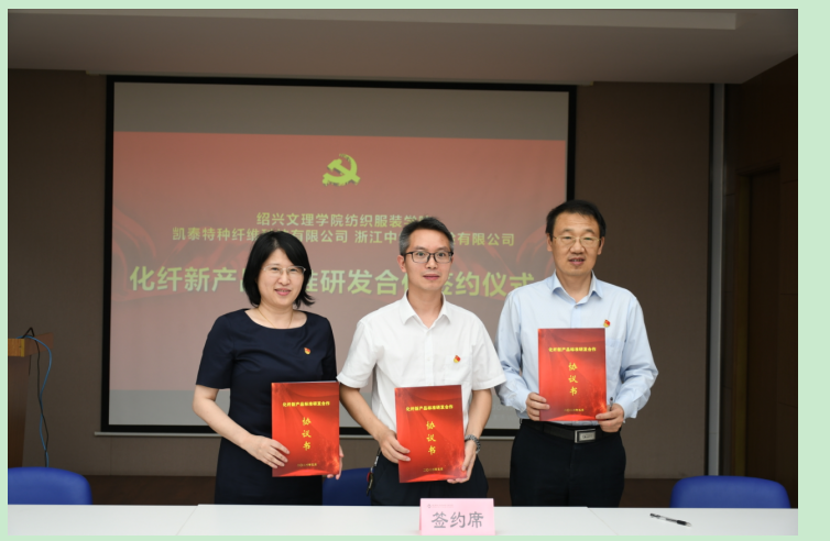 纺织服装学院与凯泰特种纤维科技有限公司、浙江中纺标检验有限公司签订《化纤新产品研发合作协议》。产业学院教授团队代表张寅江博士与浙江中纺标检验有限公司签订《纺织品非织造布触感检测旋翼刮刀法》国家标准申报起草合作协议。