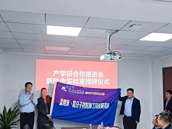 陈均土与滕明才共同为纺织科学与工程“高分子材料与加工联合实验室”揭牌,并为学校服务地方与经济社会发展“孟继承·高分子材料加工科技服务队”授旗。纺织服装学院向滕明才颁发学校“纺织科学与工程”硕士研究生导师聘书。