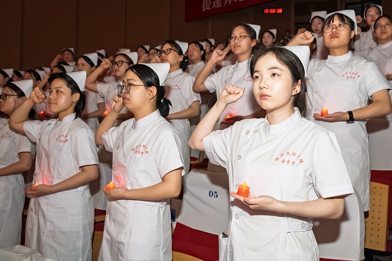 在徐华丽的领誓下,全体护生举起右手,庄严宣誓,表达了献身护理事业,奉行革命的人道主义精神,坚守救死扶伤的信念,履行“保存生命、减轻痛苦、促进健康”的职责。