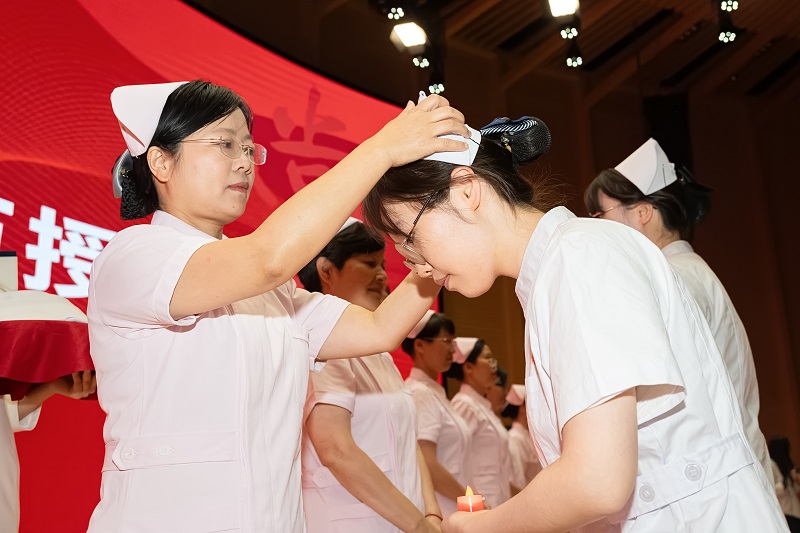 在授帽仪式上,校附属医院2024年十佳员工、护士长邢冬和陶晓红老师为学生点燃象征着南丁格尔精神的红色蜡烛,并依次传灯,点亮了现场所有护生手中的蜡烛;十位护理前辈为现场所有学生代表授帽,此时氛围格外庄严而神圣。