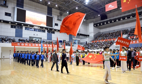 在观看了校党委宣传部为本届运动会精心创作的专题微电影(链接:http://v.youku.com/v_show/id_XODE0NjY1OTY0.html)之后,国旗、校旗、会徽、运动员、裁判员以及各二级学院、教职工代表方阵依次入场。金秋十月,青春激荡,各方阵昂扬饱满的精神风貌、各具特色的口号标语,充分展现了文理师生积极向上、拼搏进取的蓬勃朝气。