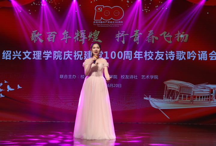 校友们精彩演绎了15首精选原创诗歌作品——《南湖红船》《满江红·百年回眸》《百年红船颂》等作品,回顾、歌颂了中国共产党建党百年的悠久辉煌历史;《汉宫春·访母校宋六陵校区》《城南大道900号》《风则江廊桥》《一场春天的约会——献给卓越奖》等作品带大家领略了绍兴和学校的独特魅力……