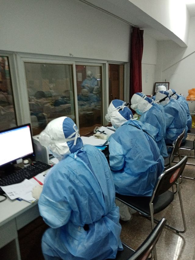 方舱的病人虽然是轻症病人,但很多人的心理负担是极重的,有些人担心外面或者正在其他医院住院的家人。能得到家人的平安信息,对他们来说就是一剂良药。我们医疗队组织了心理救援小队,一床一床地访视,有条不紊地对他们进行心理辅导。完成这些工作,护目镜里已经都是水汽,模糊的镜面让我只能看到眼前的人而看不清到底是谁。当然,套上两层手套坐在电脑旁下医嘱,也是另一番滋味。