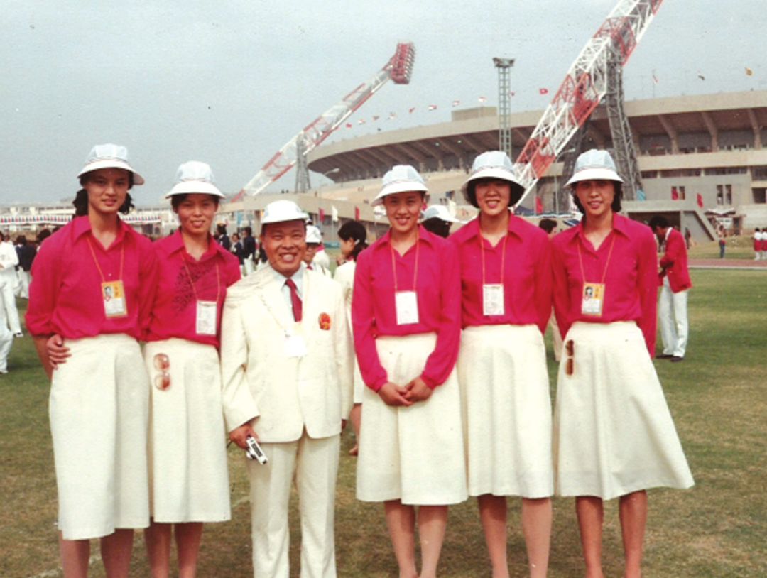 ▲1982年11月,印度新德里,鲁光(左三)与中国女排姑娘合影。(资料照片)
