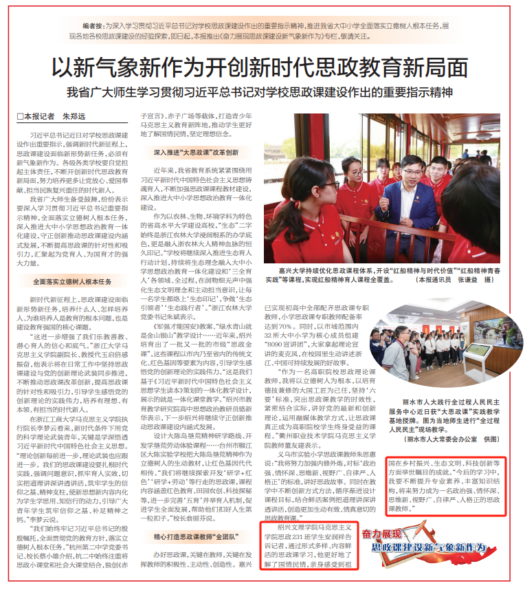 “这进一步增强了我们乐教善教、潜心育人的信心和底气。”浙江大学马克思主义学院副院长、教授代玉启倍感振奋,他表示将在日常工作中坚持思政课建设与党的创新理论武装同步推进,不断推动思政课改革创新,提高思政课的针对性和吸引力,引导学生感悟党的创新理论的实践伟力,培养有理想、有本领、有担当的时代新人。