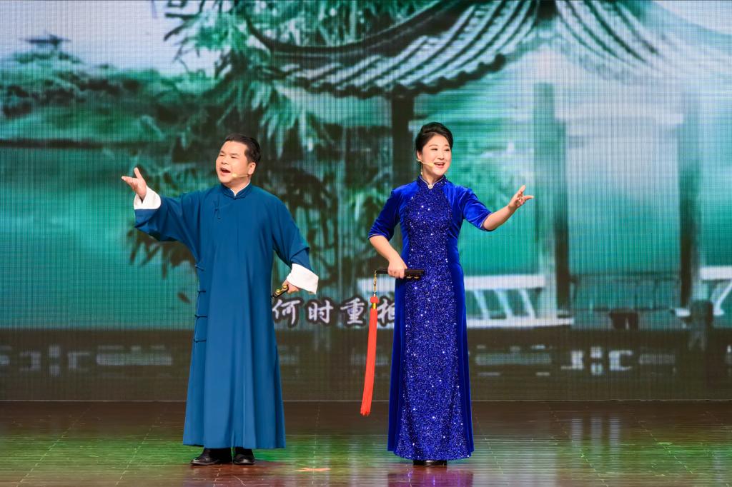 当晚的演出汇聚了多位戏曲名家,节目涵盖了越剧、绍剧、莲花落、平湖调、宣卷、弹簧、词调等多种绍兴本土剧种和曲种。中国牡丹表演奖得主潘家富、施金裕带来了绍兴莲花落《十八相送》,以动人的旋律和优美的戏词,将观众带入充满情感的故事情境中。中国戏剧“梅花奖”得主赵秀治与中国牡丹表演奖得主潘家富联袂出演的《稽山鉴水》选段,以首部莲花落八幕舞台剧的创新形式,生动形象地展现了绍兴的历史故事和文化特色。