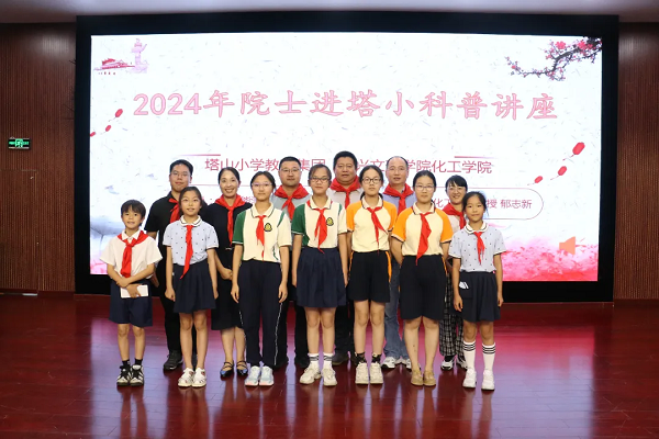 9月11日下午,绍兴市塔山小学崇德校区的三楼报告厅内,一场专为科学而设的盛会如期举行。绍兴市塔山小学党委书记蒋华卫、校长陈燕萍,我校化学化工学院党委书记徐青,挪威工程院院士、化学化工学院教授郁志新,化学系党支部书记刘海玲、副主任沈骐和塔山小学师生代表参加2024年院士进塔小科普讲座,并开展科学副校长聘任仪式。