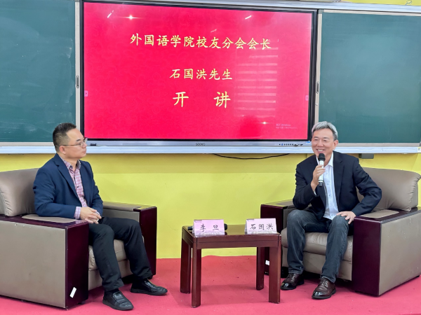 外国语学院与外国语学院校友会共同创建“迪梦外语”校友论坛。石国洪与学院院长胡朋志、吕志伟共同为校友论坛揭牌。
